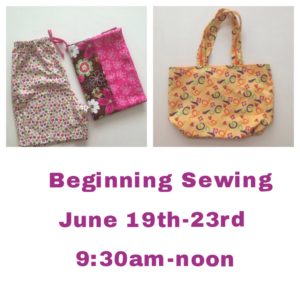Beginning Sewing (there’s a couple offered this month); Learn Your Machine; Emoji Pillow & Keychain; Time to Sew; Celebrate the 4th of July; Dream Quilt; Goin’ to the Beach; Kids Sewing Camp II; Flower Pounding; Pick Your Project; Catch Up Day